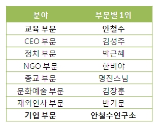 한국리더십센터는 지난 10월 14일부터 21일까지 한 주 동안 CEO분야, 교육분야, 정치분야 등 총 8개 분야에서 신뢰받는 리더를 선정했습니다. 전문경영인에서 KAIST 교수, 벤처 정신 전도사로 변신한 안철수 박사가 교육 분야 1위에 선정되었고, 올해 새롭게 선정한 신뢰받는 기업 분야에서는 안철수연구소가 최초 선정되는 영광을 얻었습니다.