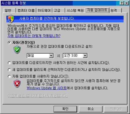 “자동업데이트”설정은 위 시스템 등록 정보의 자동업데이트 탭에서 할 수 있다. 아래 그림과 같이 “자동”으로 설정되어 있는지 확인한다. 만약 자동업데이트탭을 찾을 수 없다면 OS를 업그레이드 해야 한다. Vista의 경우에는 화면이 조금 다르게 생겼는데 내용은 동일하니 “자동”으로 설정되어 있는지 확인한다.