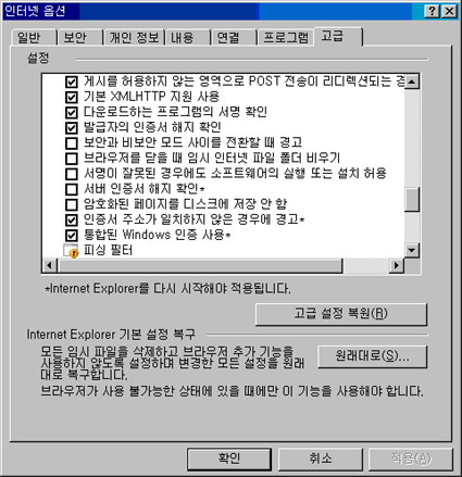 그리고, [고급]탭에서 ActiveX관련 설정이 올바르게 되어 있는지 확인한다. 잘못 설정되어 있으면 역시 프로그램이 자동으로 설치될 수 있다.