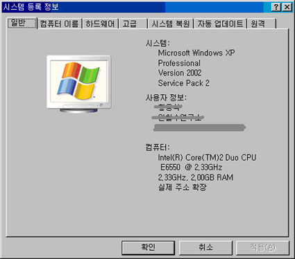 윈도우 XP ServicePack 2 이후에는 보안이 강화되어 웹서핑 중에 ActiveX와 같은 SW가 설치되지 않도록 하고 있다. 또한, 운영체제에 방화벽이 기본탑재 되어 있는 등 보안이 강화되어 있으니 가급적 최신의 OS를 사용해야 한다. 운영체제의 버전은 “시스템 등록정보”에서 확인할 수 있다. 시스템 등록정보 화면은 탐색기의 “내 컴퓨터”에서 우클릭하고 “속성”메뉴를 선택하거나 “윈도우키” + “Break키”를 누르면 볼 수 있다. Windows XP ServicePack 2 또는 Vista 운영체제인지 확인하자.