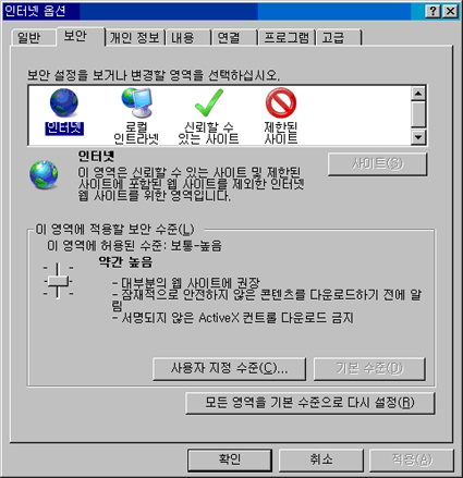IE 즉 인터넷 익스플로러가 올바르게 설정되어 있지 않으면, 자동 업데이트 설정으로 보안패치가 잘 되어 있어도 위험한 프로그램이 사용자의 동의과정 없이 자동으로 설치될 수 있다. 다음과 같이 확인해 볼 수 있습니다. IE의 [도구]메뉴에서 [인터넷옵션]을 선택한다. 보안 탭에 아래 그림과 같이 설정되어 있는지 확인한다. 아래 그림과 다르다면 운영체제와 IE가 최신버전으로 설치되어 있는지 확인하고 최신 버전으로 업데이트 한다. 최신 버전의 IE는 7이다.