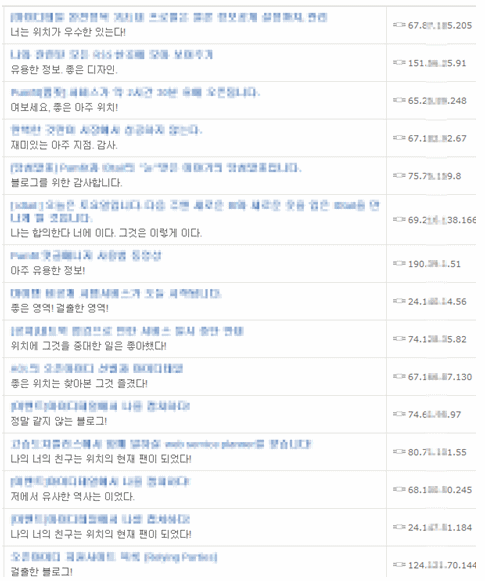 [그림 5]를 살펴보면 트랙백을 등록한 컴퓨터의 IP주소가 모두 다른 것을 확인할 수 있는데 이는 스파이웨어(Spyware)나 봇(Bot)등에 감염된 좀비 컴퓨터를 통한 지능적인 대량 공격임을 알 수 있다. 한번의 공격을 통해 적게는 몇백, 많게는 수천의 트랙백이 동시에 제각기 다른 IP주소로 등록 되어 이에 대해 스팸 필터를 적용하기도 매우 어렵다.