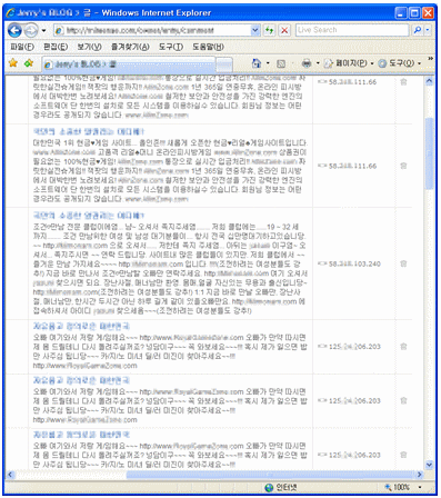[그림 5]를 살펴보면 트랙백을 등록한 컴퓨터의 IP주소가 모두 다른 것을 확인할 수 있는데 이는 스파이웨어(Spyware)나 봇(Bot)등에 감염된 좀비 컴퓨터를 통한 지능적인 대량 공격임을 알 수 있다. 한번의 공격을 통해 적게는 몇백, 많게는 수천의 트랙백이 동시에 제각기 다른 IP주소로 등록 되어 이에 대해 스팸 필터를 적용하기도 매우 어렵다.