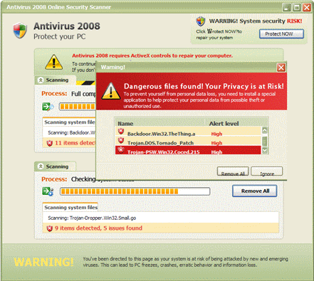 그리고 나의 컴퓨터에 바이러스가 있다는 것을 눈으로 직접 보여준다. 하지만 이 윈도우는 실제 안티 바이러스 프로그램이 아닌 단순 웹페이지로 시스템 검사 기능을 수행할 수 없으며 감염되었다는 내용 역시 100% 허구이다. 하지만 일반 사용자는 이를 확인할 방법이 없어 이를 해결하기 위해 유료 결제 후 치료를 선택해 금전적 피해를 입을 수 있다.