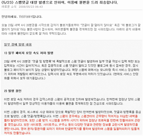 [그림 6] 대량 스팸 공격으로 서비스 이상에 대한 공지문