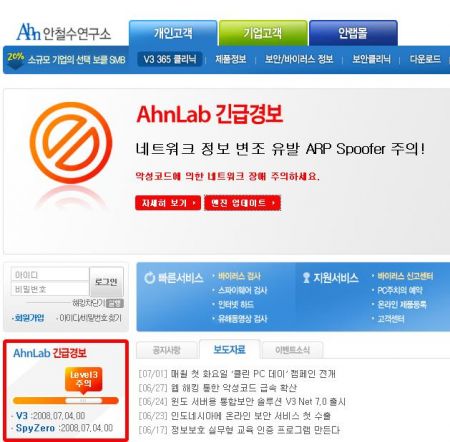 정보를 작성하는 2008년 07월 02일 15시 37분(GMT+9 기준) 현재 안철수연구소는 고객으로부터 다수의 감염 보고를 받았다.