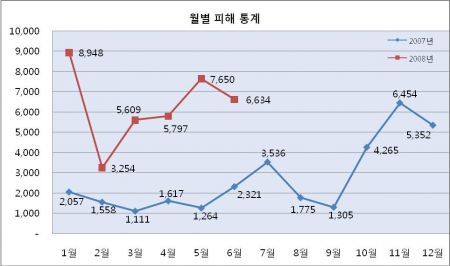 6월은 전체 6,634건의 피해신고가 접수되었으며 지난달 7,650건에서 1,000건 가량 감소했다.2008년 2월 8,948건에서 3,254건으로 크게 감소된 이후 계속적으로 증가되다가 4개월 만에 다시 피해신고 건수가 소폭감소세를 보이고 있다.