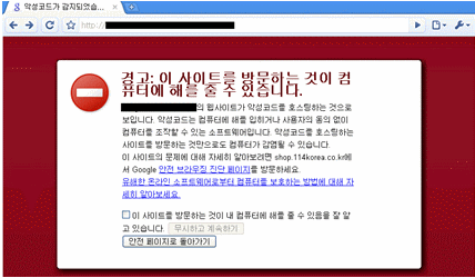 최근의 해킹동향은 공격자가 웹서버를 해킹한 후, 악성 코드 배포를 위한 페이지를 웹서버에 삽입하는 것이다. 만약, 보안 취약점의 패치를 하지 않은 사용자가 해당 웹서버에 접속할 경우, 공격자가 삽입한 코드가 실행되어 사용자의 시스템 권한을 획득할 수 있다. 따라서, 각 브라우저는 이러한 코드가 사용자의 시스템에서 실행되는 것을 막기 위해 의심 코드가 삽입된 웹페이지의 접근을 차단하고 있다. [그림 11]~[그림 13]는 다음 [그림 10]과 같은 코드를 포함한 웹페이지를 각 브라우저에 요청한 결과이다.