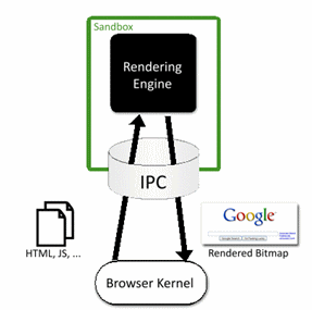 크롬(Chrome)은 샌드박스 모델을 구현하여 문제가 발생하면 쉽게 처음 상태로 초기화하여 메모리 변조 공격을 막는다. 이를 위해 크롬은 다음 [그림 2]와 같이 Rendering Engine과 Browser Kernel을 분리하여 설계하였다.