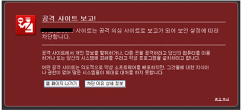 최근의 해킹동향은 공격자가 웹서버를 해킹한 후, 악성 코드 배포를 위한 페이지를 웹서버에 삽입하는 것이다. 만약, 보안 취약점의 패치를 하지 않은 사용자가 해당 웹서버에 접속할 경우, 공격자가 삽입한 코드가 실행되어 사용자의 시스템 권한을 획득할 수 있다. 따라서, 각 브라우저는 이러한 코드가 사용자의 시스템에서 실행되는 것을 막기 위해 의심 코드가 삽입된 웹페이지의 접근을 차단하고 있다. [그림 11]~[그림 13]는 다음 [그림 10]과 같은 코드를 포함한 웹페이지를 각 브라우저에 요청한 결과이다.