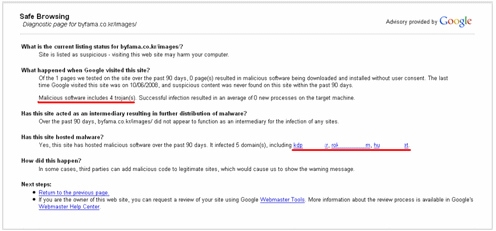 파이어폭스 3 에서는 해당 페이지를 [그림 12]와 같이 차단하였으며 해당 페이지를 차단한 이유와 현재 상태를 [그림 13]과 같이 사용자가 직접 확인할 수 있다. 특이할 만한 사항은 해당 페이지의 데이터베이스를 구글이 제공했다는 것이다. 따라서 크롬 역시 같은 데이터를 사용할 것이라고 추측할 수 있다.
