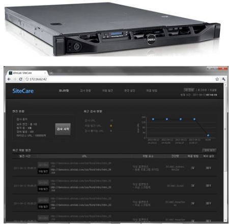 ‘사이트케어 엔터프라이즈’는 자체 개발 엔진과 실 사용자로부터 수집한 방대한 DB(데이터베이스)로 웹 위협 요소의 모니터링 효과를 극대화했다. 즉, 안철수연구소 자체 기술로 개발한 세계 최초 웹 콘텐츠 전용 검사 엔진 ‘안티 멀사이트 엔진(Anti-MalSite Engine. 보충설명2)’과, 1200만 명 이상이 사용하는 웹 보안 서비스인 ‘사이트가드’에서 수집한 위협 URL DB를 기반으로 정밀한 검사를 수행한다.
