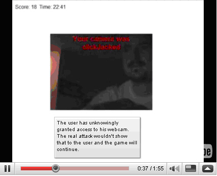 얼마 전 해외의 한 연구자가 자신의 블로그에 ‘클릭재킹’ 공격이 어떻게 이루어지는지를 동영상으로 시연을 했었다. 간단한 자바 스크립트 게임 페이지에서 게임 이용자는 화면에 나오는 버튼을 몇 번 클릭하다 보면, 본인도 모르는 사이에 자신의 컴퓨터에 연결된 웹캠으로 동영상 촬영이 되고 마이크로폰으로 녹음이 되어 버리는 상황이 벌어졌다. 이것은 어도비(Adobe)사의 플래시 플레이어 설정 매니저를 대상으로 공격을 해서 가능했던 것이었다.