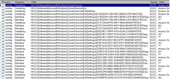 일부 리워드 프로그램은 자신의 정상동작을 위하여 다른 리워드 프로그램의 실행을 종료하고 프로그램의 일부를 삭제하거나, 경쟁 프로그램의 설치를 방해하는 기능을 포함하기도 한다. [그림 2-5]는 Win-Downloader/PointGuide.205312가 설치되면서 윈도우 레지스트리에 CLSID를 등록해 PC에 다른 리워드 프로그램이 설치되는 것을 방해하는 것이다. 이 경우 CLSID목록은 웹사이트에 저장되어 있으며, 프로그램 업데이트를 통해 변경이 가능한 것을 확인할 수 있었다.