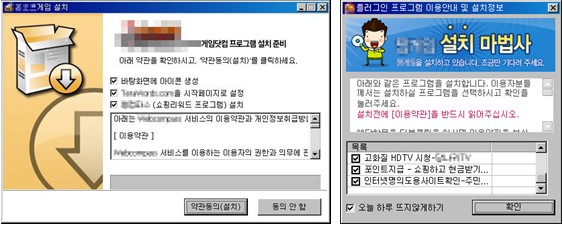 [그림 4] 오른쪽의 경우 또 다른 동의 방식을 사용한다. 고전게임을 설치하기 위해 프로그램을 실행하면, 인터넷주소변환프로그램, 즐겨찾기 등록, 인터넷 검색 도우미, 리워드 프로그램, 명의도용 차단 프로그램 등 7개의 프로그램이 번들(끼워넣기) 형식으로 설치된다. 다수의 번들 프로그램을 포함하는 동의창의 목록 아래에 표시된 각 프로그램 목록을 더블클릭하는 경우 약관이 표시된 웹사이트를 표시해 동의창을 확인할 수 있게 하였다.