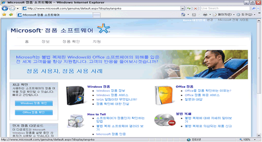 아래의 사이트에 가면 자신이 설치한 윈도우 및 오피스 프로그램의 정품여부를 확인해 볼 수 있습니다. (http://www.microsoft.com/genuine/default.aspx?displaylang=ko)