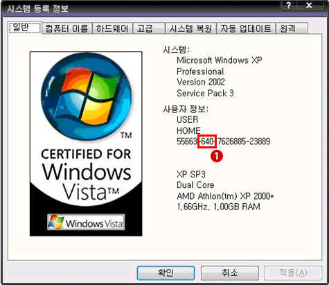 ①시스템 등록 정보의 사용자 정보 내에 XXXXX-64X-XXXXXXX-XXXXX 와 같이 ‘64’로 표기 되는 경우는 Volume License 제품으로 기업고객이 사용해야 하는 제품이며 개인 고객이 사용하는 경우 불법 입니다. 또한 정품 인증 시 불법으로 표기가 되게 되며 정품 사용자가 받는 서비스를 받지 못할 수 있습니다.