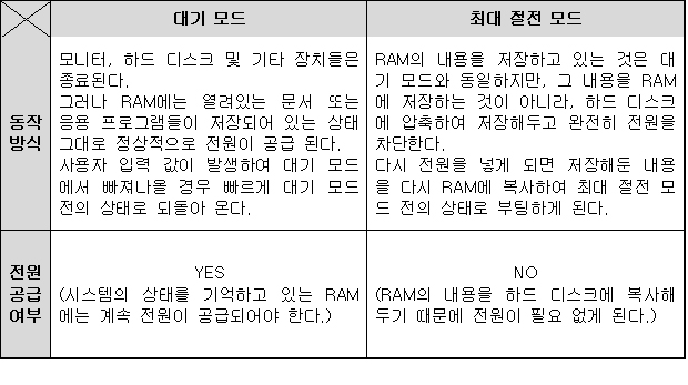 [표 1 대기 모드와 최대 절전 모드의 비교]