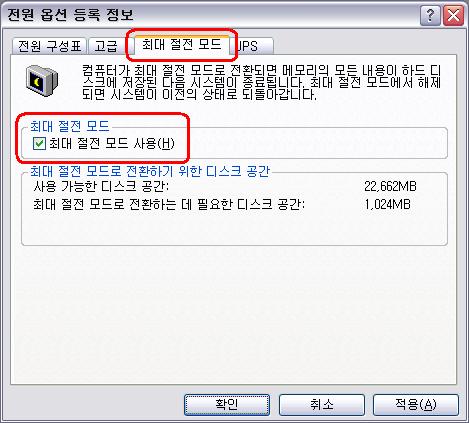 [시작] -> [제어판] -> [성능 및 유지 관리] -> [전원 옵션]을 차례로 눌러 전원 옵션 등록 정보 창을 띄운다. [그림 1] 에서처럼 최대 절전 모드 탭이 존재한다면, 최대 절전 모드의 사용이 가능한 것이다.