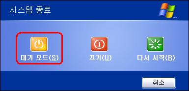 그러나 아직은 대기 모드 버튼만 보일 뿐, 최대 절전 모드로 진입하기 위한 버튼이 보이지 않는다. 이 상태에서 Shift 키를 누르고 있게 되면 아래 [그림 3]과 같이 대기 모드 버튼이 최대 절전 모드 버튼으로 변하게 된다.