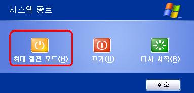 최대 절전 모드 사용 항목에 체크를 하고 확인을 눌러 적용하게 되면 이제 최대 절전 모드를 사용할 준비가 된 것이다. 이제 실제로 최대 절전 모드를 이용하여 시스템을 종료해보자. [시작] -> [컴퓨터 끄기]를 누르게 되면 아래 [그림 2]와 같이 사용자들에게 익숙한 시스템 종료 창이 뜨게 된다.