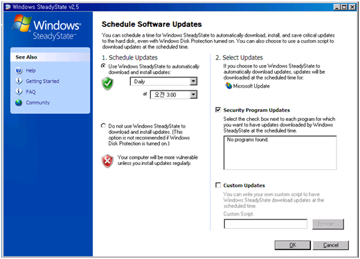 설치가 완료되면 바탕화면에 “Windows SteadyState” 바로가기 아이콘이 보인다. 더블 클릭하여 실행하면 위의 그림1과 같은 화면을 볼 수 있다. 먼저, 화면 가운데 “Global Computer Settings” 아래 두 번째 “Schedule Software Updates” 메뉴를 선택하여 PC가 자동으로 업데이트 되도록 설정하자.