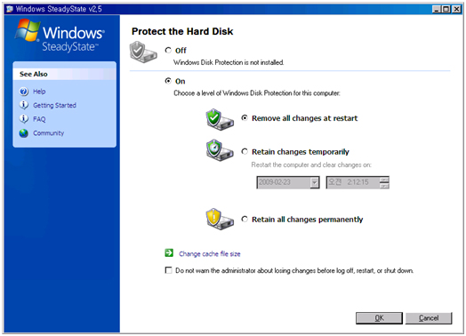 위 그림과 같이 설정하면 재 부팅할 때마다 이전 상태로 복원하게 된다. “OK”버튼을 클릭하면 재 부팅하게 되고 기능이 동작한다. 추후에 영구적으로 설치해야 되는 프로그램이 있다면, Protect the Hard Disk기능을 끄거나 위 화면에서 잠시 “Retain all changes permanently”로 설정하고 프로그램을 설치하면 된다.