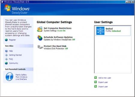 사실 잘 알려져 있진 않지만 MS에서 공용PC를 관리하기 위한 도구를 제공하고 있다. 아래 경로에서 무료로 다운 받을 수 있는 Windows SteadyState이 바로 그것이다. Windows SteadyState는 이름에서 풍기는 것처럼 공용PC의 상태를 일정하게 유지시켜 주는 일을 한다. PC를 원래 상태로 복원시킨다거나 사용자 환경을 제어하고 개별 프로그램에 대하여 접근을 제한할 수 있다.
