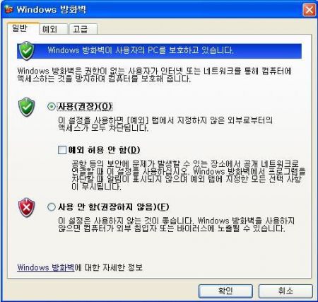 [일반]탭에선 윈도우 내장 방화벽을 사용 여부와 예외를 허용 여부를 선택할 수 있는 간단한 메뉴를 제공한다. 특별히 다른 방화벽을 사용하지 않는 경우라면 [사용(권장)]을 체크하면 된다. 하지만 V3 Internet Security 와 같이 통합 보안 제품을 사용하는 경우라면 별도의 방화벽을 제공하므로 해당 제품을 사용하는 것이 좋다.