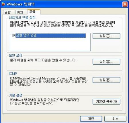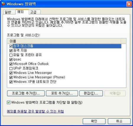 그림 2 윈도우 내장 방화벽 [예외] 탭