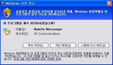 실제 윈도우 방화벽을 사용 중 이라면 다음과 같은 다이얼로그를 자주 접할 수 있다. 방화벽 설정에 추가되지 않은 프로그램이 네트워크 접근 시 다음과 같은 다이얼로그가 발생한다. 이때가 매우 중요한데 만약 자신이 필요에 의해 설치한 프로그램이라면 “차단 해제”를 눌러 방화벽에서 네트워크가 차단되는 것을 제외할 수 있다. 하지만 자신이 설치하지 않은 처음 보는 프로그램이 네트워크 접속을 시도한다면 한번쯤 의심을 해 보아야 한다. 프로그램의 이름과 게시자등이 불분명한 경우 악성코드 설치 및 개인 정보 유출이 발생할 수 있으므로 “계속 차단”을 눌러 네트워크 접근을 차단하는 것이 바람직하다.