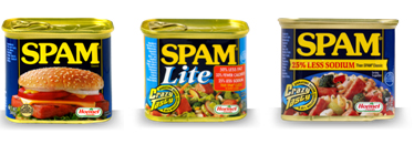 스팸 메일의 진화를 살펴보기 전에, 먼저 스팸 통조림의 진화를 한번 살펴보자. 최근 들어서 건강을 많이 걱정하는 소비자들이 스팸 통조림을 많이 먹지 않게 되자, 스팸 통조림도 고객의 관심을 끌기 위해 변신을 시도하여 다양한 형태의 변형된 상품을 생산하게 되었다. 지방과 칼로리를 줄인 Spam Lite, 나트륨의 양을 줄인 Spam less Sodium 등. 또한, 최근의 어린이들의 입맛에 맞게 여러 가지 변형시킨 제품들을 다양하게 생산하고 있다.