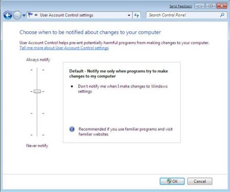 보안성 향상의 기초는 사용권한의 분리이다. 마이크로소프트는 사용자 편의를 위한 다는 명목으로 계속 미뤄왔던 것이다. 사용자들이 Vista의 UAC를 너무 불편해 하고 있기 때문에 마이크로소프트에서는 Windows 7에서 보안성이 조금 떨어지더라도 사용성이 크게 높아 질 수 있는 UAC옵션을 새롭게 추가하였다. 이 옵션은 항상 UAC를 띄우는 것 대신에 프로그램이 임의로 시스템을 변경할 때만 UAC를 띄우도록 하고 있다. 즉, 사용자가 시스템설정을 변경할 때는 UAC를 띄우지 않는 다는 것이다. 이 옵션은 UAC가 나타나는 케이스를 크게 줄이고, 실질적인 위협에 적절히 대처할 수 있도록 함으로써 적절한 선을 찾았다는 평가를 받고 있다