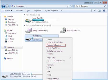 하드디스크를 암호화할 때와 달리 TPM을 사용하지 않고, 패스워드나 스마트카드를 사용하여 암호화 한다. TPM을 사용하게 되면 다른 컴퓨터에서는 USB메모리를 사용할 수 없게 되므로, 여러 컴퓨터에서 사용해야 하는 USB메모리와 같은 이동식 저장장치에는 TPM을 사용할 수 없다.