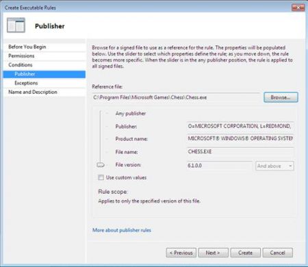 앱락커는 룰기반으로 설계되어 보다 유연하게 관리할 수 있다고 한다. 예를 들면 마이크로소프트에 의하여 서명된 오피스 2003 이상은 모두 설치되도록 허가 한다와 같은 룰의 설정이 가능하다. 앱락커는 실행파일과 윈도우 인스톨러, 스크립트에 대해서 제어할 수 있으며, 인증서에 기반한 Publisher와 Path, File hash 세가지 방법으로 규칙을 작성할 수 있다. 파일이나 폴더 단위로 세세하게 규칙을 작성해야 하기 때문에 개인사용자가 사용하기엔 어려우나 어플리케이션을 통제하고자 하는 의지가 있는 기업환경에서는 효과적으로 사용할 수 있을 것으로 생각된다.