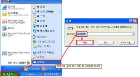 ① 먼저 msconfig(시스템 구성 유틸리티) 창을 띄워야 합니다. 윈도우 하단 트레이에 있는 [시작]버튼을 클릭하고 [실행] 메뉴를 선택하면 입력창이 뜹니다.