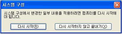 그런데 선택 or 해제 후 [적용]→[닫기] 순으로 선택하면 재부팅 관련 경고창이 나타납니다. 이때 작업하던 모든 작업은 저장하고 [다시 시작]을 선택하여 재부팅을 합니다.