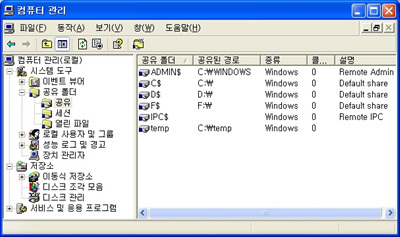 그림 2 컴퓨터 관리중 공유 폴더 항목