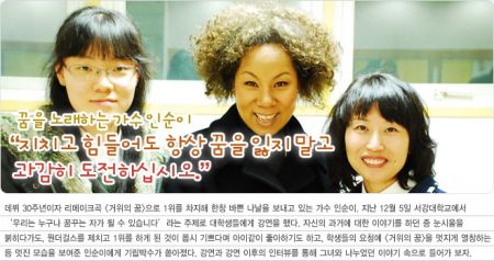 그동안 에이즈 어린이 돕기, 지체장애인을 위한 콘서트, 독거노인을 위한 사랑의 집짓기 등의 자선활동을 해온 가수 인순이는 “산다는 것은 녹록치만은 않다”는 말로 강연을 시작했다.