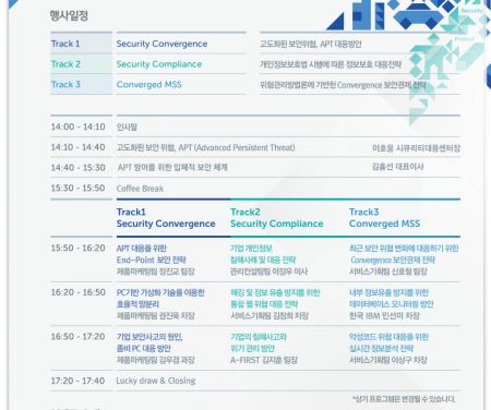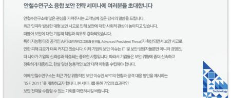 이번 행사는 새로운 보안 위협에 대한 대응 방안 소개와 안철수연구소의 보안전략 및 주요 제품을 소개하는 자리에 많은 관심과 격려 부탁드립니다. <Ahn>
