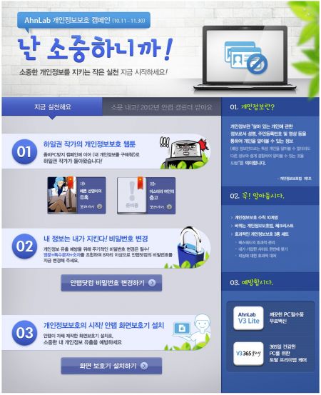 글로벌 통합보안 기업 안철수연구소(대표 김홍선 www.ahnlab.com)는 최근 개인정보보호법의 발효에 맞춰 올바른 개인정보보호 전파를 위해 오는 11월 30일까지 “안철수연구소 개인정보보호 캠페인 ‘난 소중하니까’”를 진행한다.