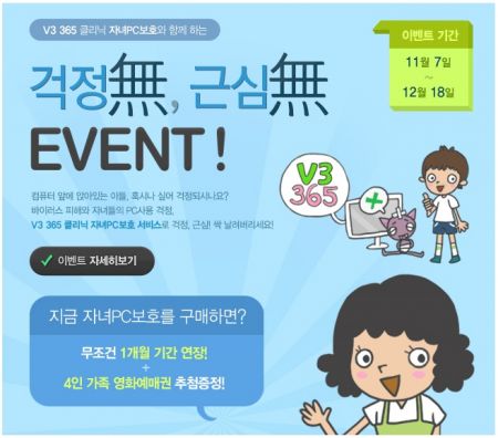 개인 사용자의 경우 12월 18일까지 ‘V3 365 클리닉 자녀PC보호’를 구매하는 고객 모두에게 서비스 사용 기간 1 개월 연장의 혜택을 제공한다. 또한 추첨하여 뽑힌 30명에게는 4인 가족 영화 예매권을 증정한다. 자녀의 무절제한 PC 사용과 바이러스 피해에 대한 걱정을 한 번에 덜 수 있는 절호의 기회다. (http://shop.ahnlab.com/jump/jsp/fp/event/2011/11_03/event.jsp)