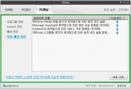 V3 Lite의 메인 창에서 ‘PC튜닝’ 탭을 누르면 위와 같은 메뉴가 나타난다. 여기서 ‘PC 관리’ 버튼을 누르게 되면 다음과 같이 컴퓨터에 설치된 여러 가지 프로그램, ActiveX, 툴바, Windows 업데이트 항목들을 한 눈에 볼 수 있도록 정리해준다.