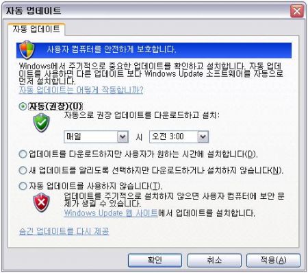 [그림 3 Windows XP의 Windows Update 설정 화면]