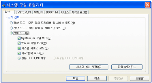 1. 일반 탭 : 부팅 시 사운드, 그래픽 등 장치 드라이버의 로딩과 시스템 복원 관련 사항