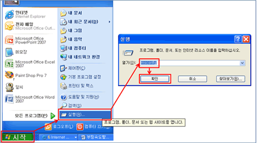 ① 먼저 msconfig(시스템 구성 유틸리티) 창을 띄워야 합니다. 윈도우 하단 트레이에 있는 [시작]버튼을 클릭하고 [실행] 메뉴를 선택하면 입력창이 뜹니다.