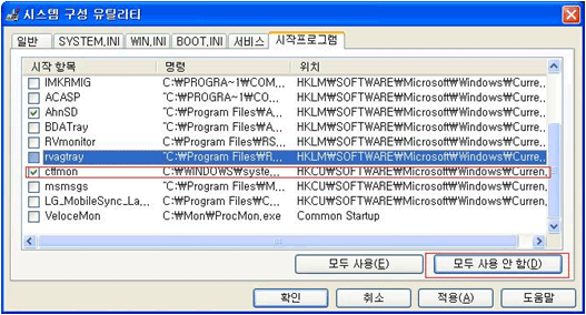 이에 체크된 항목을 모두 사용 안 함으로 선택해도 무방하지만 ‘시작 항목’이나 ‘명령’을 확인하여 정말 필요한 항목만 설정한다면 보다 효율적인 시작프로그램 항목을 만들 수 있습니다.