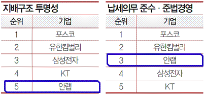 - 지배구조 투명성 부문 5위, 납세의무 준수 및 준법 경영 부문 3위