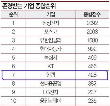 매경이코노미가 올해 처음으로 ‘대한민국에서 존경받는 기업’을 선정한 결과, 삼성전자가 종합 1위의 영예를 안았다. 종합 2위와 3위는 포스코와 유한킴벌리가 차지했다. 많은 대기업 계열사의 뒤를 이어 안랩은 SW기업으로는 가장 선두인 종합 7위로 뒤를 이었다.
