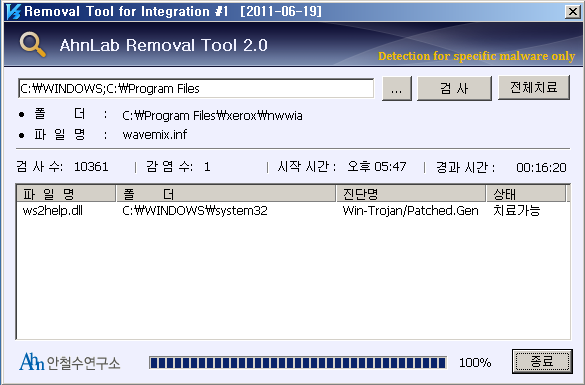[그림 6] 전용백신으로 해당 악성코드를 검출한 화면